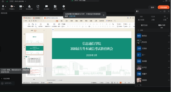 为切实做好2026年专升本考试工作,信息通信学院坚持“以生为本”理念,围绕诚信教育、模拟演练、服务保障等重点环节,周密部署、精心组织,全力为考生保驾护航。3月16日,学院组织召开专升本全体考生线上诚信教育暨安全警示大会,传达了学校关于专升本考试的最新要求,逐条解读了考试文具规范及“无声入场”具体标准。结合信息通信专业特色,会议特别提醒考生在备考及返校途中警惕利用无线电设备、网络社交等实施的各类新型诈骗手段,切勿轻信“出售作弊器材”“传递答案”等网络谣言,切实保护个人信息与财产安全。与会人员集中观看了警示教育片,通过真实案例深入剖析考试作弊的严重后果,进一步强化了考生的法治观念和诚信意识。