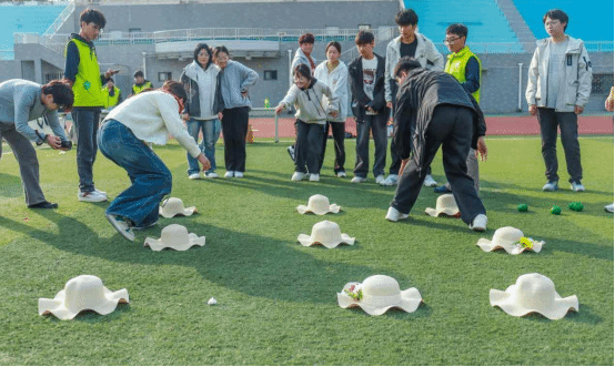 “秋运传心球”(轨道传球):8人一组拉住绳网组成“传输轨道”,要将乒乓球稳稳送向终点桶。“小心!球要歪了!”当球在轨道上摇晃时,大家立刻压低绳网、调整角度,眼神紧紧盯着球的轨迹;即便球偶尔掉落,没人抱怨,而是立刻捡球重新出发。“掉了就再来,大家一起想办法,比赢了更有成就感!”负责控绳的同学说。
