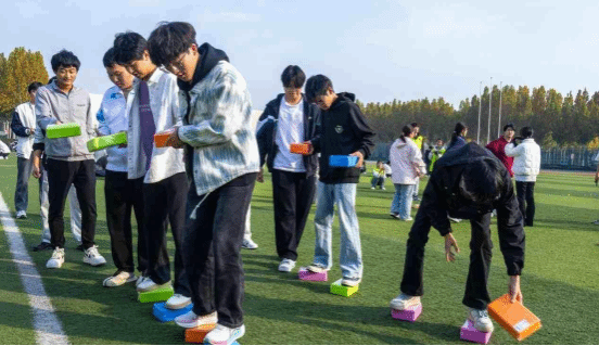 “同心渡秋河”(摸石头过河):每组5人手持3块“河石”,需交替踩石从赛道一端抵达终点。刚开始,有的小组因步伐混乱频频“落水”,急得直跺脚;但很快大家调整策略,有人喊节拍“1-2-1”,有人伸手扶稳队友,最后默契配合着“一步一挪”冲向终点。